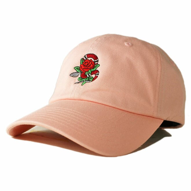 フロントにヘビとバラが刺繍されたロープロファイルキャップ。