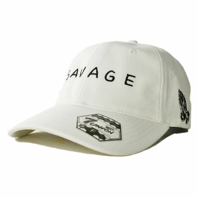 フロントにSAVAGE(直訳はキチガイですが、スラングでヤバイとかイケテル、かっこいいを意味する)、左サイドにゴッドハンド、バックにSEVEN UNIONを刺繍したストラップバックキャップ。