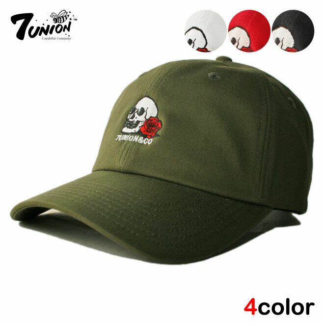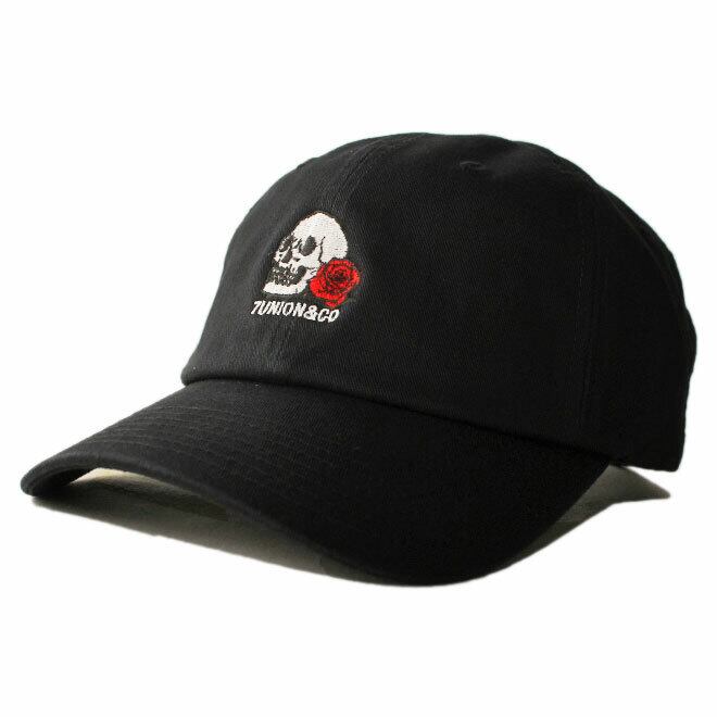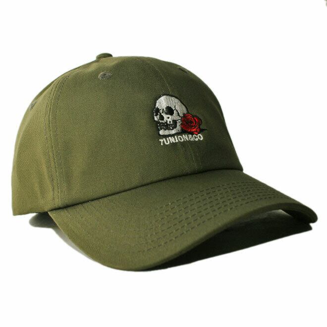フロントにスカルとバラを刺繍したロープロファイルキャップ。