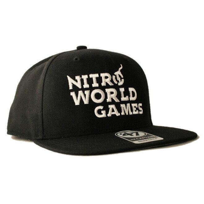 フロントにNITRO WORLD GAMESロゴ、左サイドにブランドロゴが刺繍されたスナップバックキャップ。