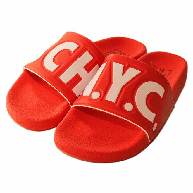 右足にSCH、左足にN.Y.C.がプリントされたスポーツサンダル。