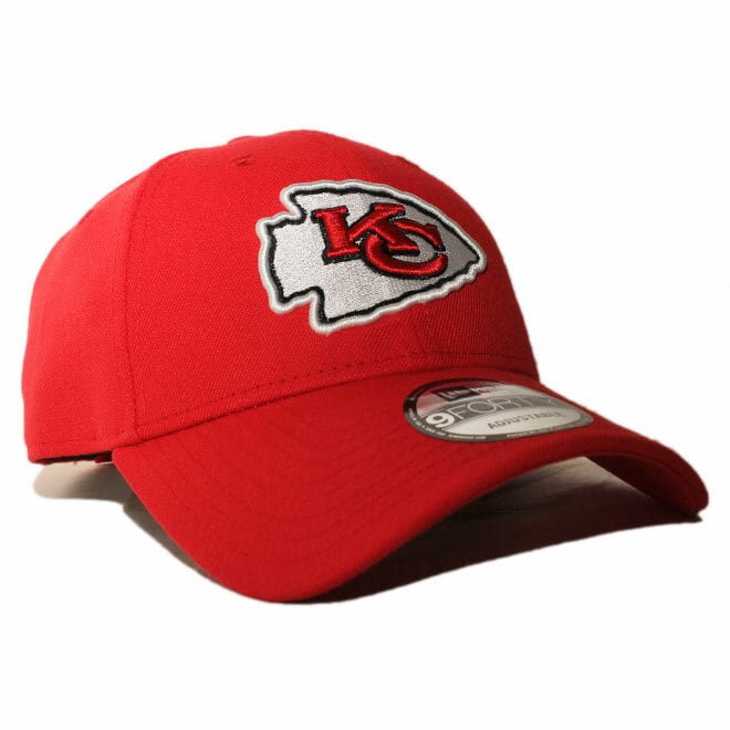 フロントにカンザスシティ チーフスのチームロゴ、左サイドにNEW ERAロゴ、バックのストラップ部分にもチームロゴネームが刺繍されたモデル。
