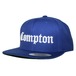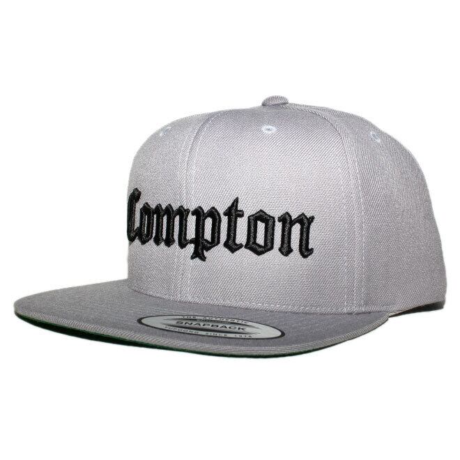 フロントにオールドイングリッシュフォントのコンプトンロゴが刺繍されたスナップバックキャップ。