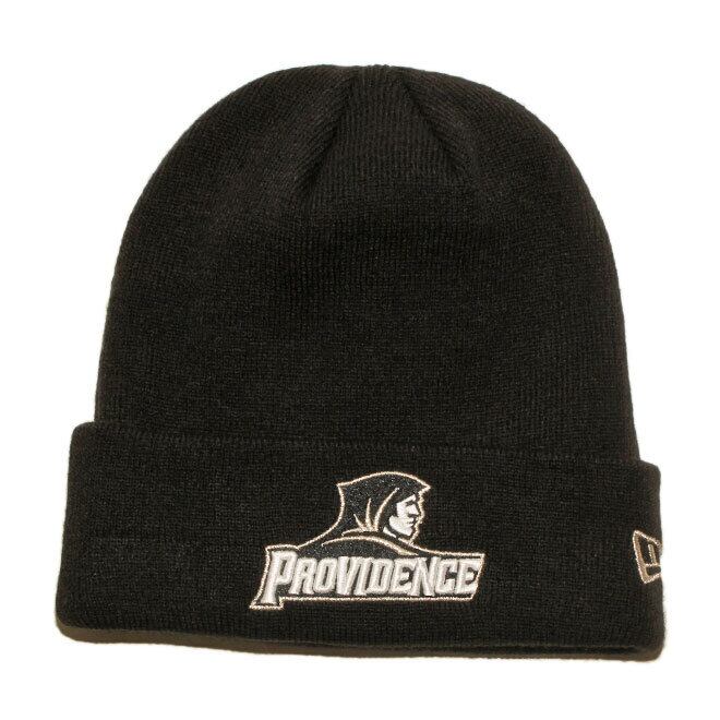 フロントにNCAAのプロビデンス フライヤーズのチームロゴ、左サイドにNEフラッグロゴ、バックにチーム名が刺繍されたニット帽。