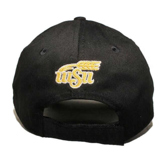 フロントにNCAAのウィチタステイト ショッカーズのチームロゴ、左サイドにNEフラッグロゴ、バックにもチームロゴが刺繍されたモデル。