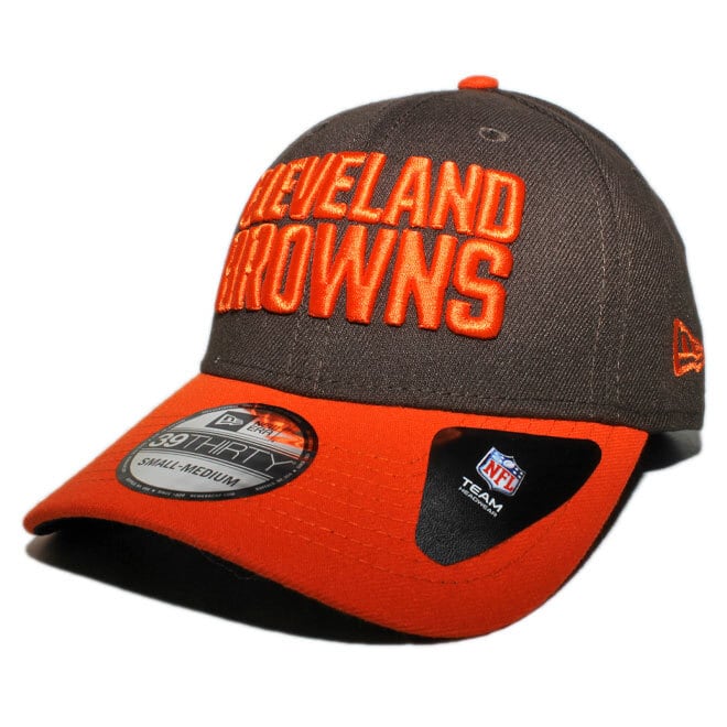 フロントにNFLのクリーブランド ブラウンズのチームロゴ、左サイドにNEフラッグロゴ、バックにチーム名が刺繍されたモデル。