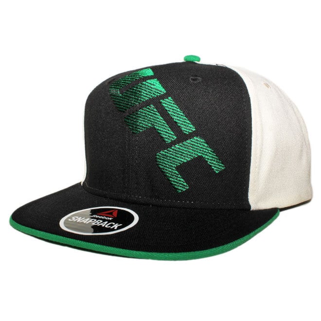 フロントにUFCロゴ、右サイドにReebokロゴが刺繍されたスナップバックキャップ。