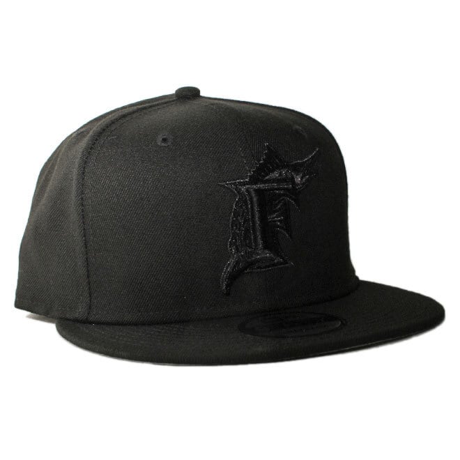 フロントにフロリダ マーリンズのチームロゴ、左サイドにNEW ERAロゴが刺繍されたスナップバックキャップ。