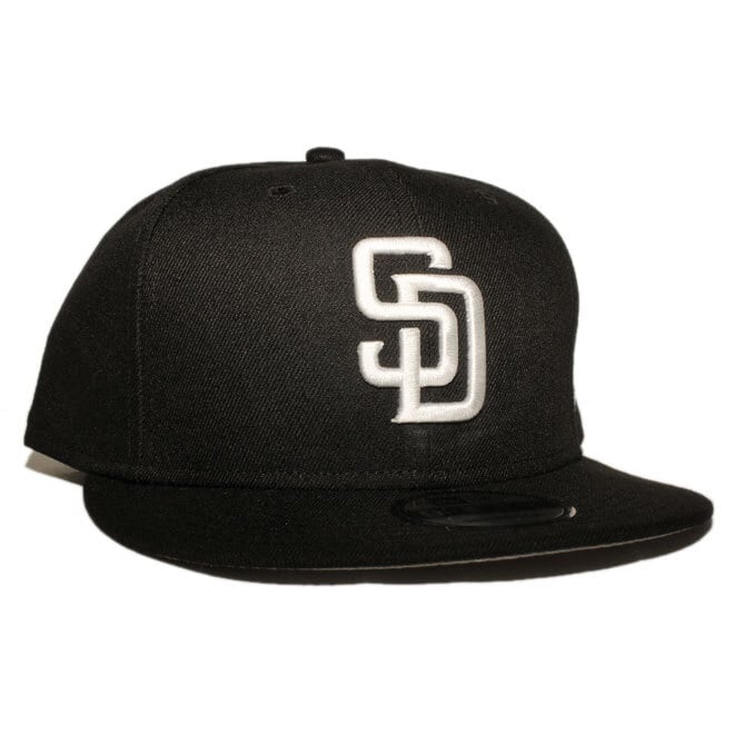 フロントにMLB / メジャーリーグのサンディエゴ パドレスのチームロゴ、左サイドにNEフラッグロゴが刺繍されたスナップバックキャップ。
