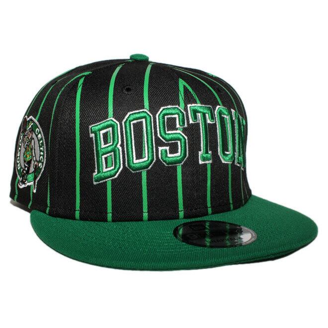 フロントにNBA / バスケットボールリーグのボストン セルティックスの都市名、左サイドにNEフラッグロゴ、右サイドにチームロゴ、バックにNBAロゴが刺繍されたスナップバックキャップ。