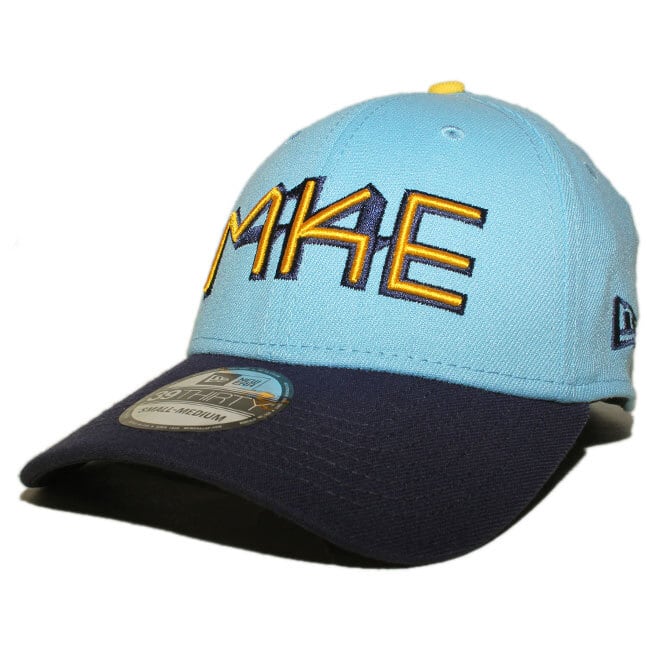 フロントにMLB / メジャーリーグのミルウォーキー ブルワーズの空港の略称「MKE」とその裏に隠れるように市外局番の「414」、左サイドにNEフラッグロゴ、ミルウォーキーの人民旗へのオマージュとしてパウダーブルー、イエロー、ネイビーを使用したモデル。