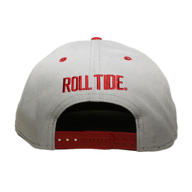 フロントにNCAA / 全米大学体育協会のアラバマ クリムゾンタイドのチームロゴ、左サイドにNEフラッグロゴ、バックにROLL TIDEの文字が刺繍されたスナップバックキャップ。