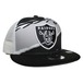 フロントにNFL / アメリカンフットボールリーグのラスベガス レイダースのチームロゴ、左サイドにNEフラッグロゴが刺繍されたモデル。