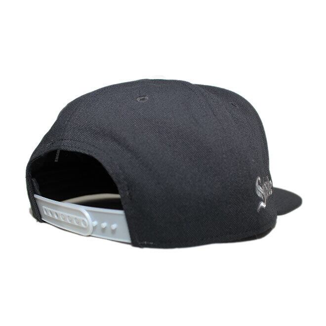 フロントにMLB / メジャーリーグのシカゴ ホワイトソックスのチームロゴ、左サイドにスウッシュロゴ、右サイドに本拠地のあるサウスサイド(シカゴ市南部)が刺繍されたスナップバックキャップ。
