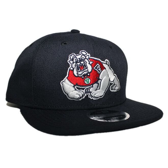 フロントにNCAA / 全米大学体育協会のフレズノステイト ブルドッグスのチームロゴ、左サイドにNEフラッグロゴが刺繍されたスナップバックキャップ。
