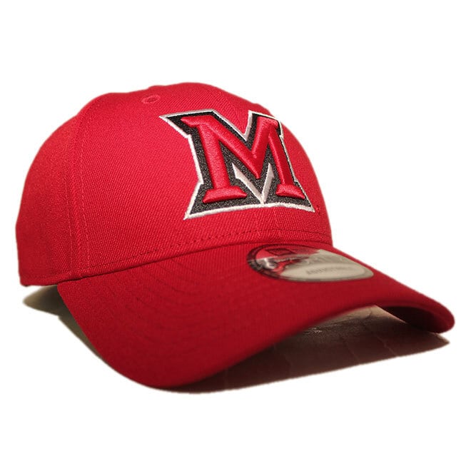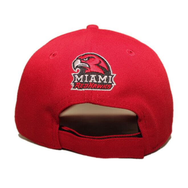 フロントにNCAA / 全米大学体育協会のマイアミ レッドホークスのチームロゴ、左サイドにNEフラッグロゴ、バックにもチームロゴが刺繍されたモデル。